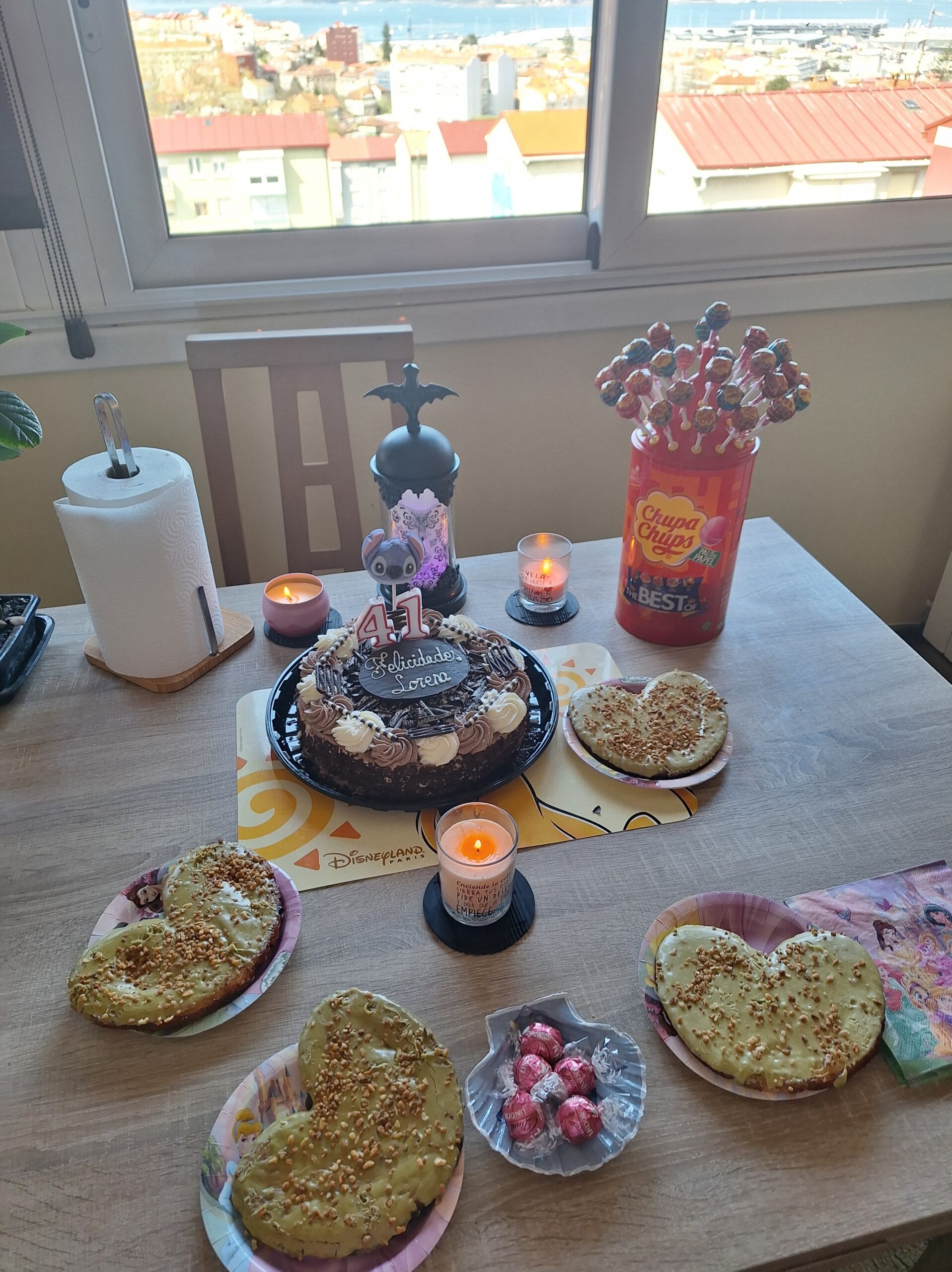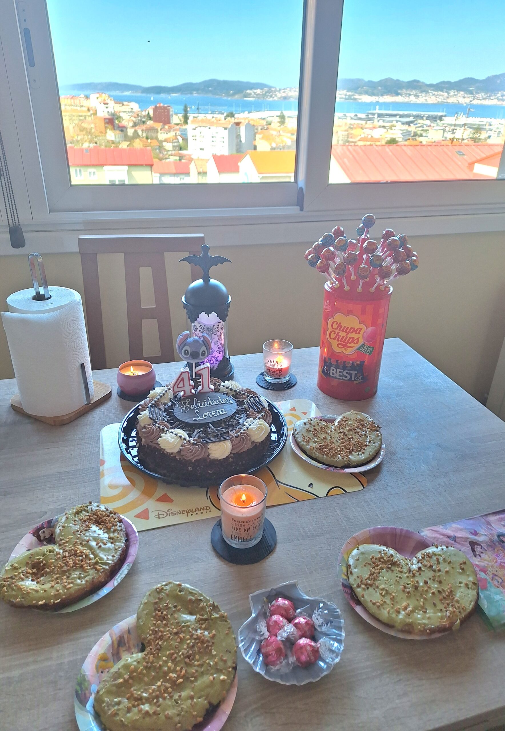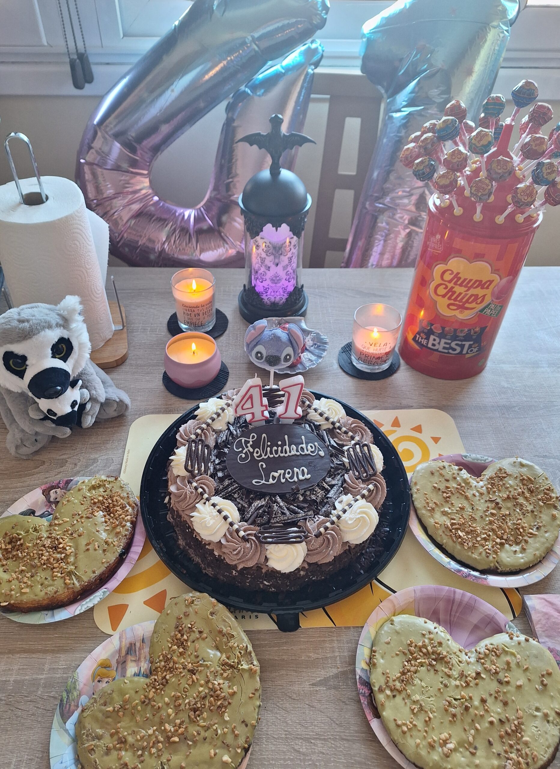Y hoy 21 Marzo antes de irme al musical celebre en casa mi cumple al mediodía comiendo francesiña casera que hicimos muy rica a la portuguesa y soplando las velas del 41 años entre globos, también con una canapés, chupa chups, palmeras de pistacho, te Matcha, bombones, chuches (bolsitas que prepare variadas), velas aromáticas con mensajes positivos y la tarta todo en casa con mi familia en la tarde de hoy Sábado 21 Marzo 2026: