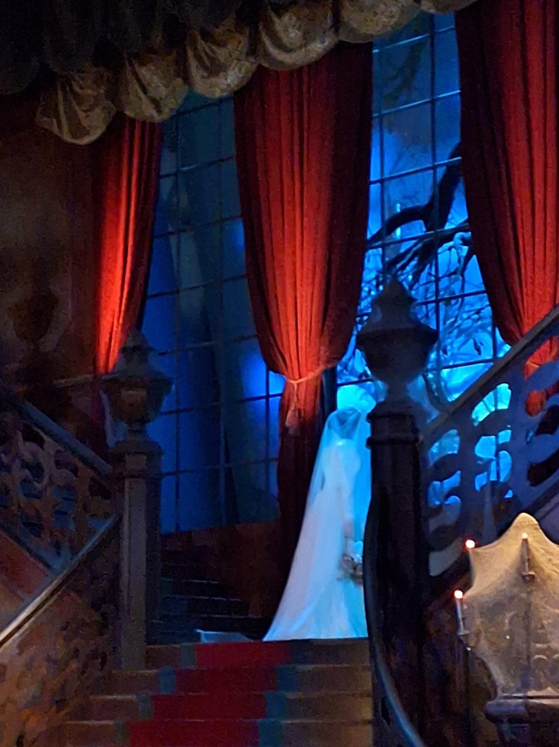 Y al ser Halloween pues pusieron un ambientazo alucinante tipo pub todo oscuro y con una larga mesa decoradisima, telas imitando telas de araña, una enorme tarta de boda decorada en la mesa principal la tarta del espíritu de la novia de la Phanton Manor (Melanie Ravenswood) con la maqueta pequeñita en la parte superior de la tarta de la Phantom Manor es decir la que era su casa cuando la familia estaba viva esta historia no es ningún mito ni nada fantasioso ni irreal pues todo lo contrario lo que mas me gusta es que está basado en hechos reales y yo de primera mano pude comprobarlo más tiempo y mejor que nadie dentro de esa atracción, en otro post que he colgado en este mismo Blog hace unos días os conté la historia de Melanie y su familia que es la historia completa de la Phantom Manor la atracción que os dije .