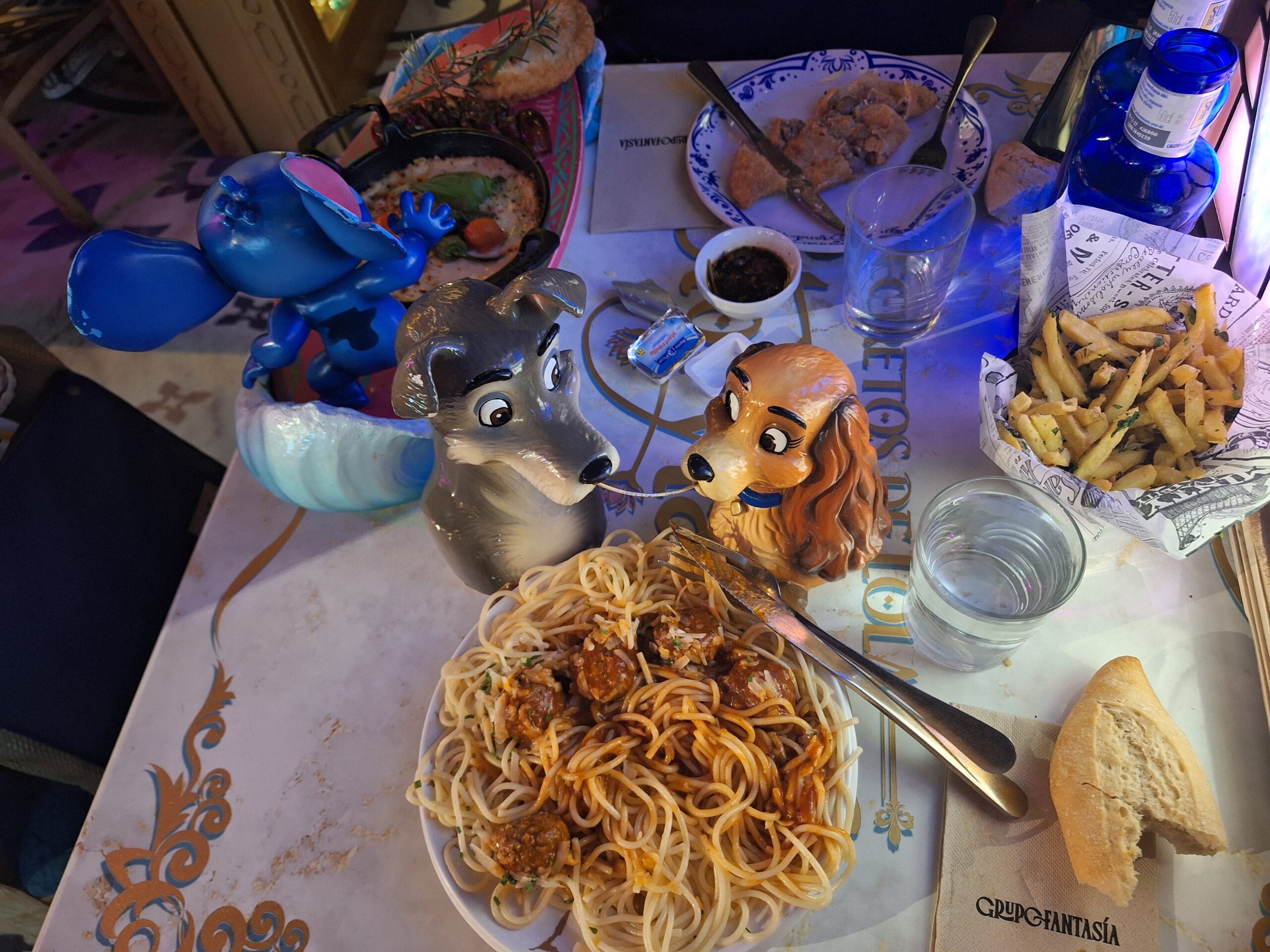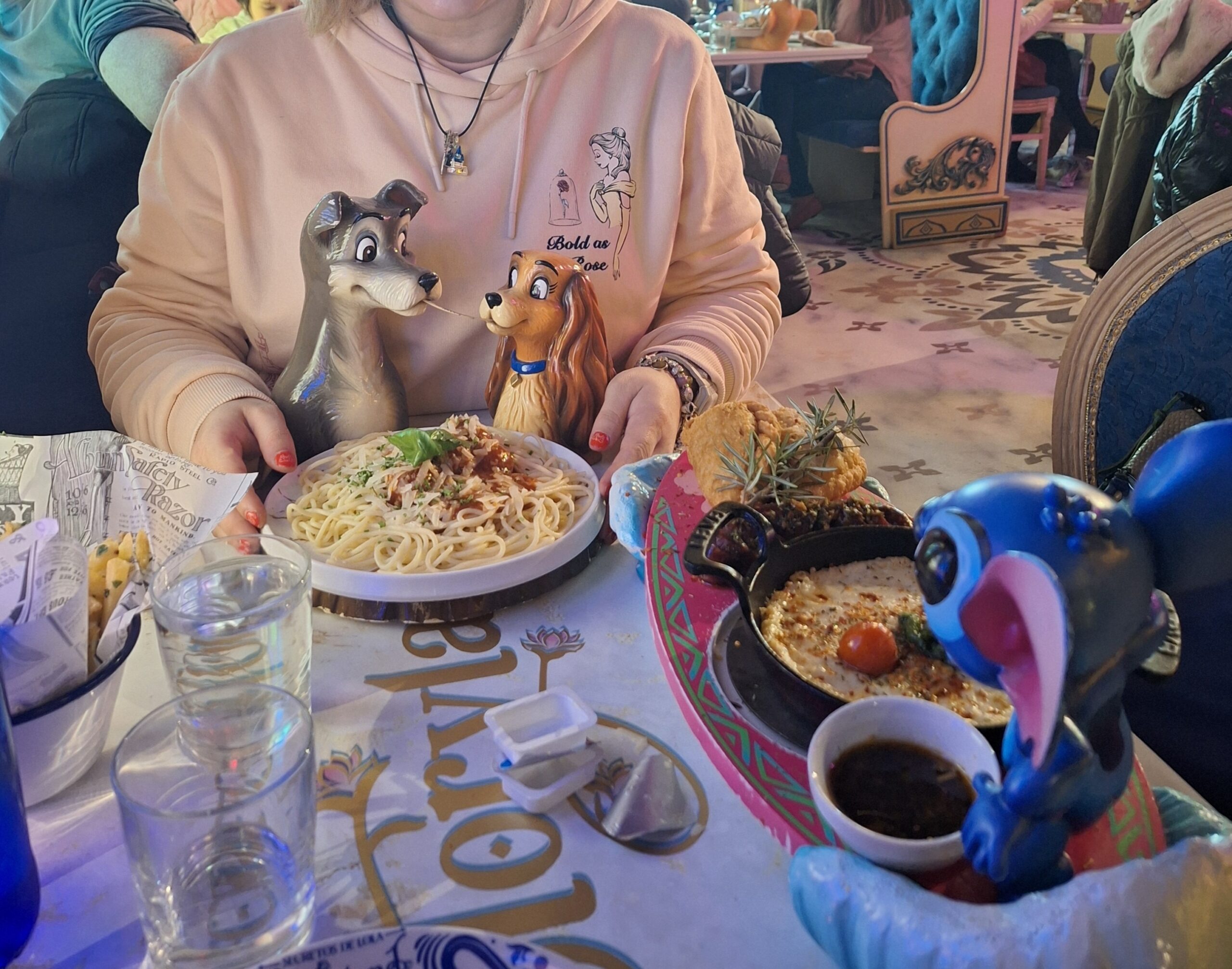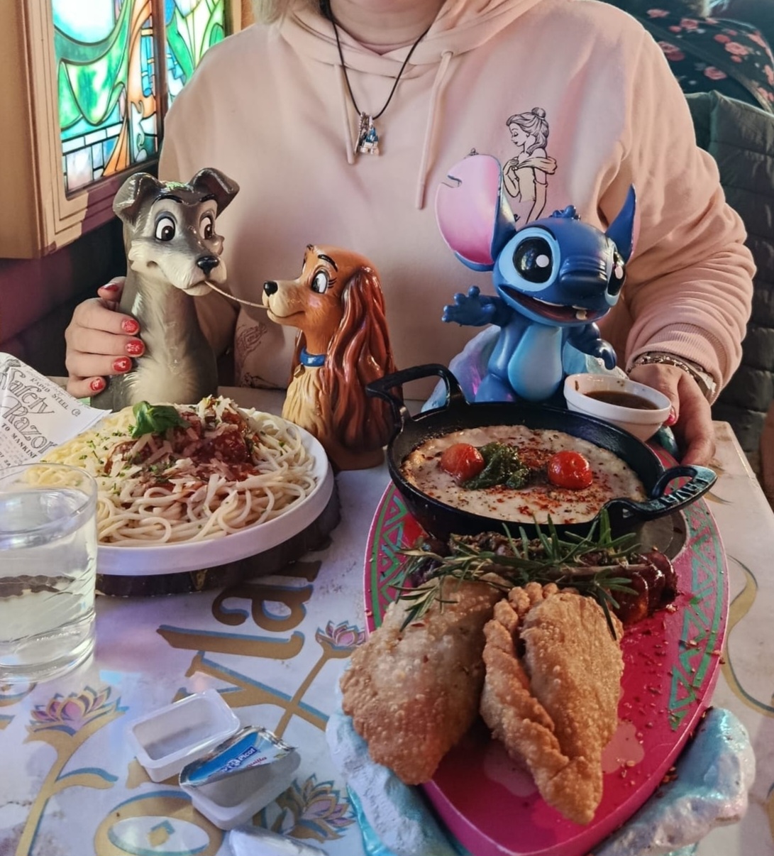 1. Comí y disfrute muchísimo en el Restaurante Storyland Madrid basado en tematica Disney donde todo es precioso, un encanto tanto la decoración como el personal y la comida de lujo rica y con muy buena presentación, ambientazo positivo, buena energía y decoración súper mágica toda de Disney hasta el mínimo detalle no pasa nada desapercibido allí y te sientes en un mini Disney y fue muy guay. Eso sí hay que reservar mínimo 2 o 3 meses con antelación y cuesta muchísimo cojer reserva pues es unicamente a través de su web. Si vais os va encantar pero que sepas esto y que de barato no tiene nada, es igual de precio que comer en un Restaurante de Disneyland Paris pero aun asi merece mucho la pena la experiencia porque pagas la experiencia la decoracion de los platos el ambiente que dan la temática etc yo lo entiendo y volvería!, hasta me cantaron una canción, y yo al despedirme les dije a ver si abrís uno en Vigo porque yo seria clienta fiel eso seguro jeje. Estuve en el Restaurante de 13:15 h que tenia mi reserva hasta las 15:15 h, es el máximo de tiempo permitido por mesa que podéis estar 2 horas pero son mas que suficientes aunque yo no querria irme nunca jeje me paso como cuando voy a Disney, y de comer pedí de entrantes las croquetas riquísimas de Remy que vienen servidas en la torre effeil, y luego pedimos para mí el plato de la Dama y el Vagabundo que es pasta con albóndigas y queso parmesano con un rico sabor italiano, y para él pedimos un plato quera una tabla de Stitch de criollo, provolone a la sarten y 2 empanadillas de carne. Y tambien pedimos para compartir una racion grande de patatas de ajo y perejil a la provenzal que estaban buenísimas.
