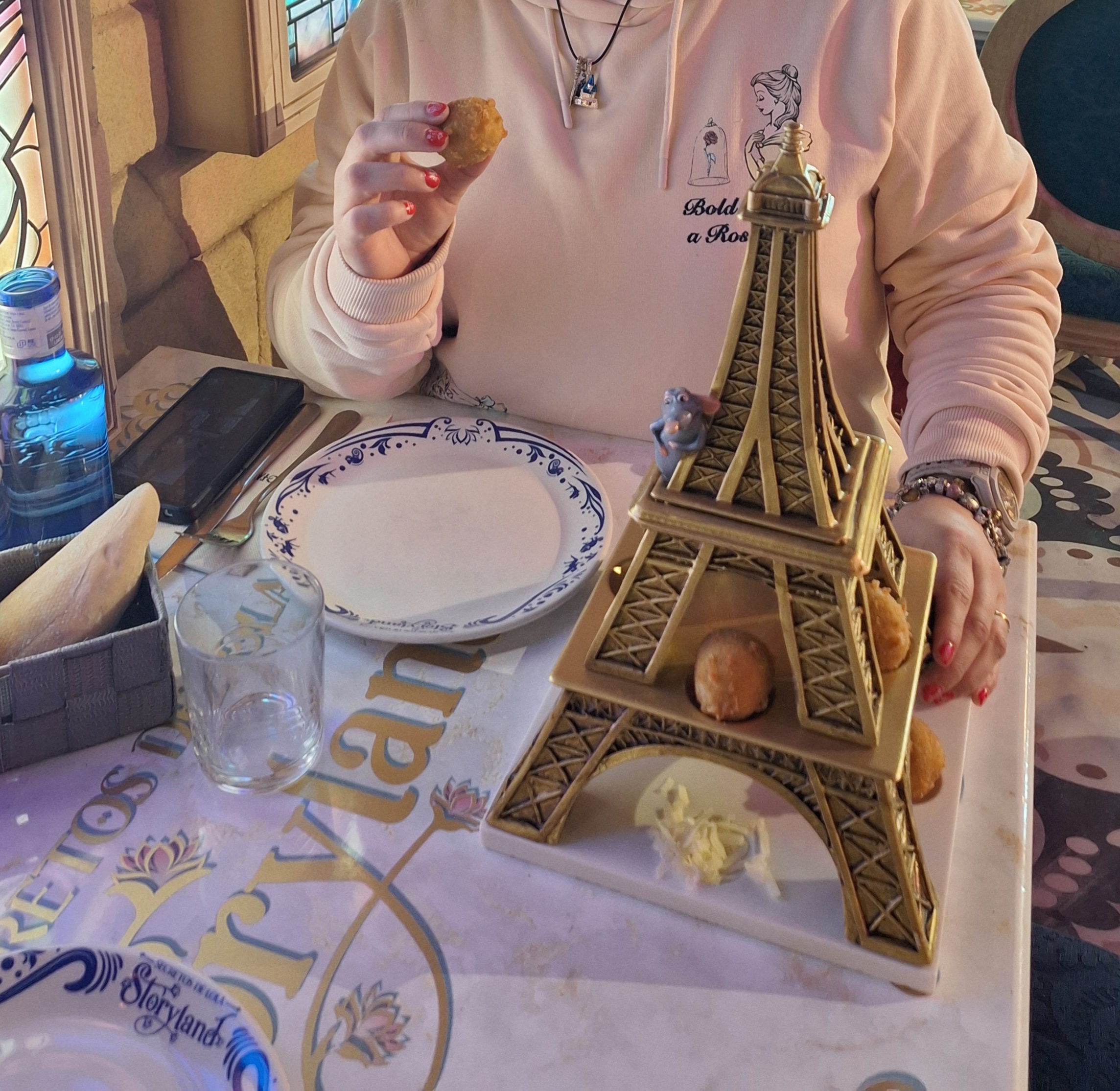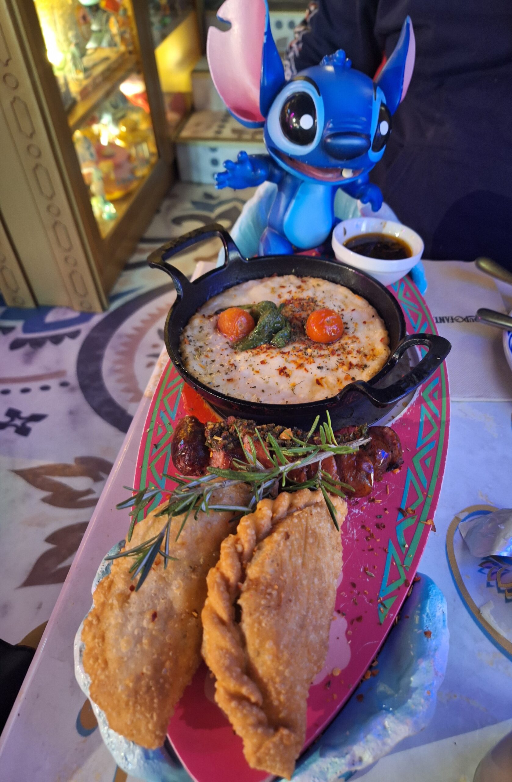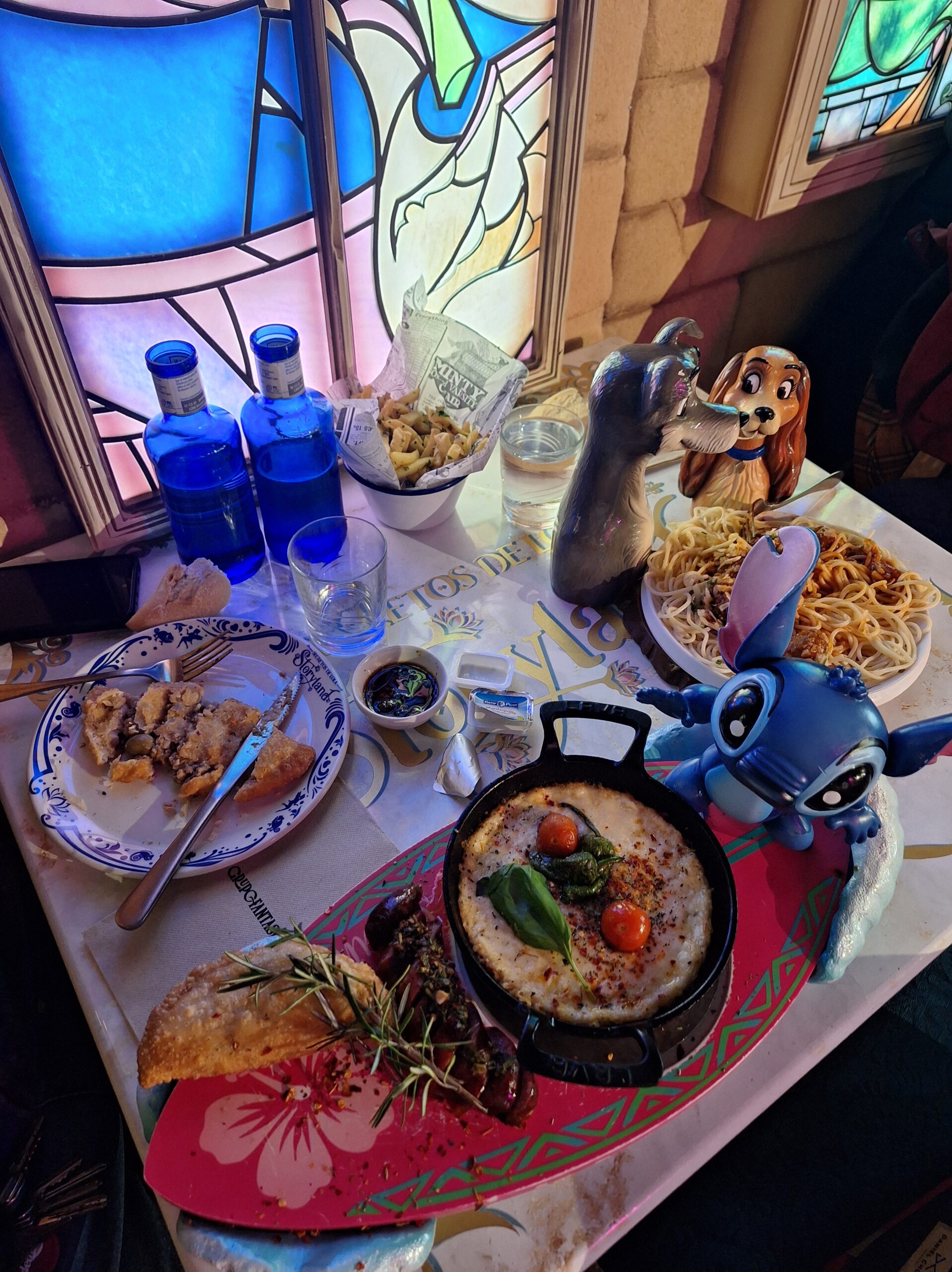 1. Comí y disfrute muchísimo en el Restaurante Storyland Madrid basado en tematica Disney donde todo es precioso, un encanto tanto la decoración como el personal y la comida de lujo rica y con muy buena presentación, ambientazo positivo, buena energía y decoración súper mágica toda de Disney hasta el mínimo detalle no pasa nada desapercibido allí y te sientes en un mini Disney y fue muy guay. Eso sí hay que reservar mínimo 2 o 3 meses con antelación y cuesta muchísimo cojer reserva pues es unicamente a través de su web. Si vais os va encantar pero que sepas esto y que de barato no tiene nada, es igual de precio que comer en un Restaurante de Disneyland Paris pero aun asi merece mucho la pena la experiencia porque pagas la experiencia la decoracion de los platos el ambiente que dan la temática etc yo lo entiendo y volvería!, hasta me cantaron una canción, y yo al despedirme les dije a ver si abrís uno en Vigo porque yo seria clienta fiel eso seguro jeje. Estuve en el Restaurante de 13:15 h que tenia mi reserva hasta las 15:15 h, es el máximo de tiempo permitido por mesa que podéis estar 2 horas pero son mas que suficientes aunque yo no querria irme nunca jeje me paso como cuando voy a Disney, y de comer pedí de entrantes las croquetas riquísimas de Remy que vienen servidas en la torre effeil, y luego pedimos para mí el plato de la Dama y el Vagabundo que es pasta con albóndigas y queso parmesano con un rico sabor italiano, y para él pedimos un plato quera una tabla de Stitch de criollo, provolone a la sarten y 2 empanadillas de carne. Y tambien pedimos para compartir una racion grande de patatas de ajo y perejil a la provenzal que estaban buenísimas.