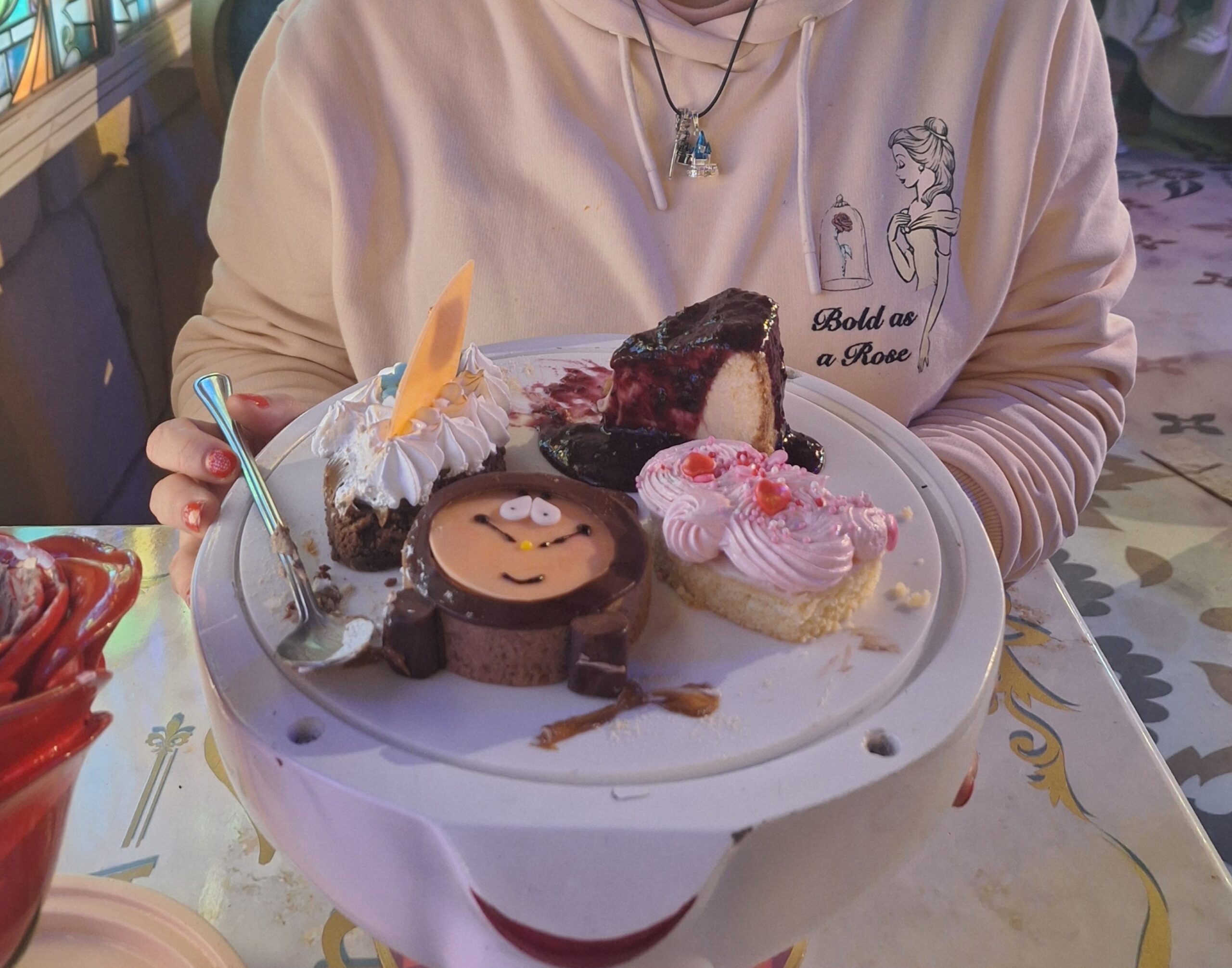 Y luego de último y para compartir pues eran muchos los postres eran 5 postres los que pedimos solo para 2 personas; El postre de la rosa de la Bella y la Bestia rellena de mousse de chocolate, y la Señora Potts que lleva dentro 4 postres entre ellos Din Don, pero la comida fue lo mas rico aunque estaba todo delicioso.