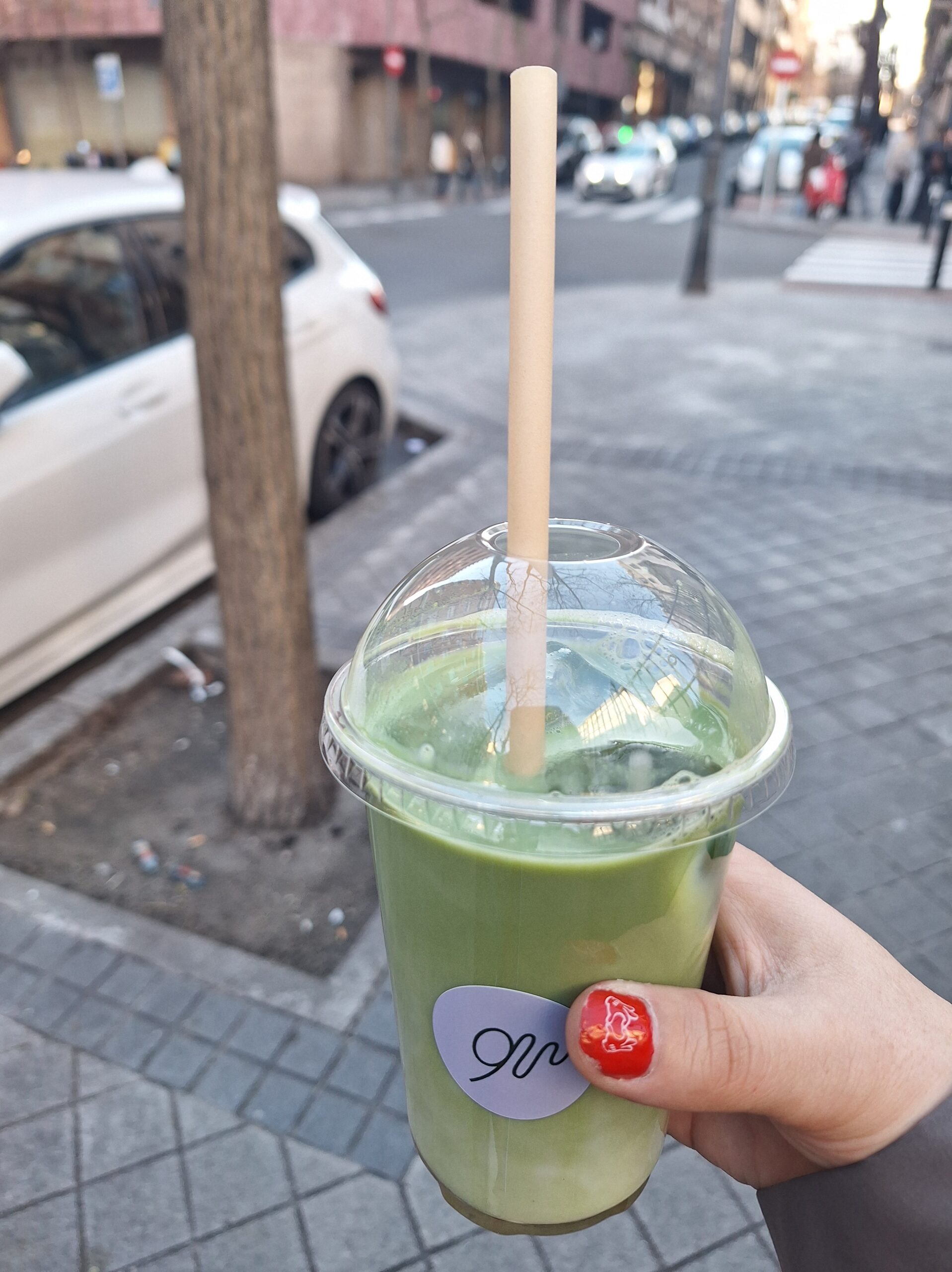 2. Disfrute de un riquísimo Te macha bien frío con vainilla del local Maison Matcha paseando al sol y el calorazo que hizo en Madrid el Sábado 21 Febrero 2026 que clima más bueno tuve en Madrid todo el tiempo el finde nada que ver con Galicia, parecía que allí había llegado ya la primavera!.