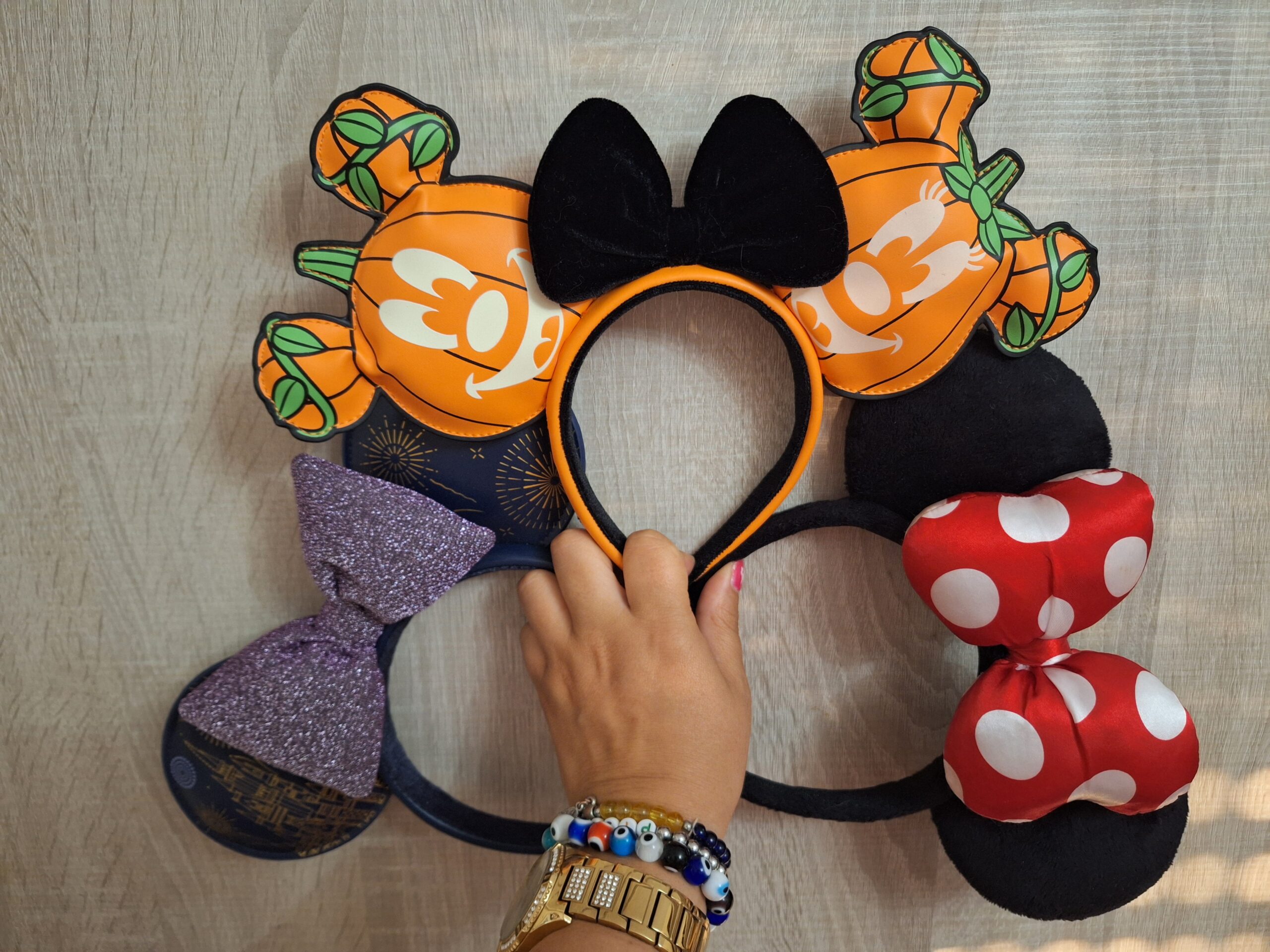3 diademas diferentes de orejitas: la de Halloween, la del castillo, y la de Minnie.