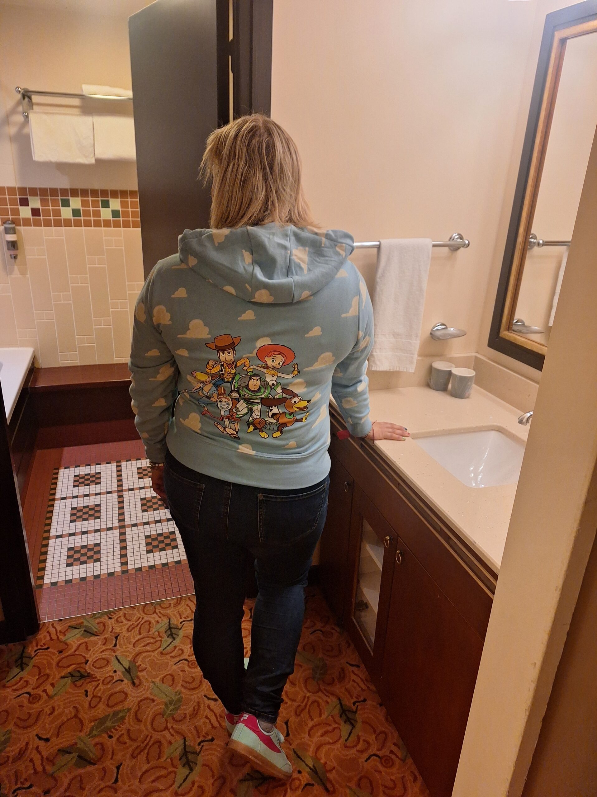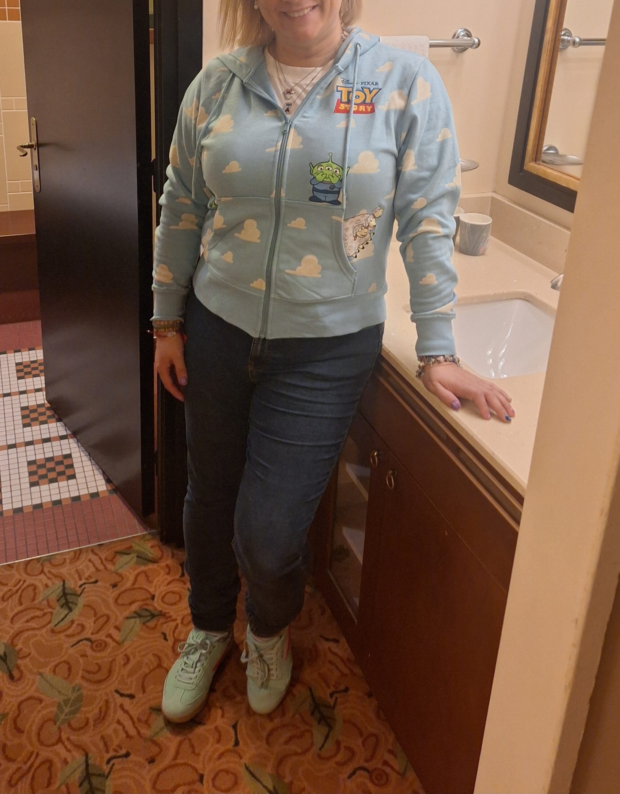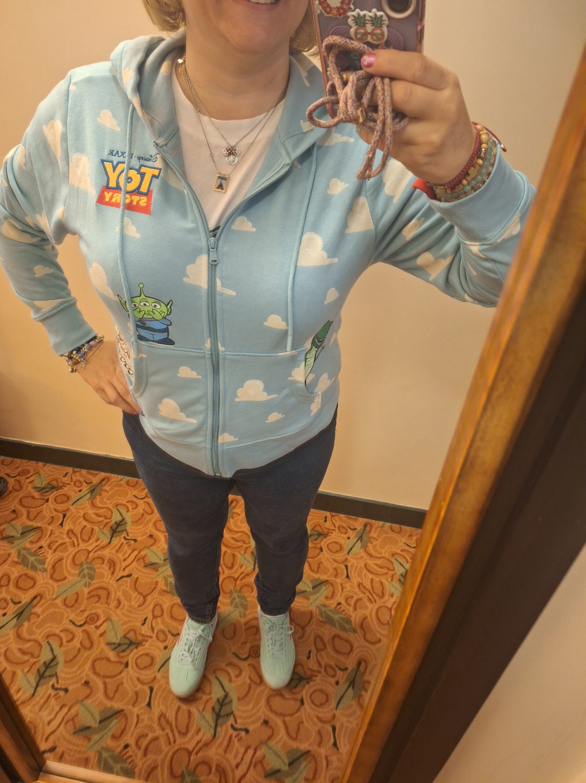 3 sudaderas de Disney distintas: La sudadera de Stitch, la chaqueta de Toy Story, la sudadera de Goofy con camisetas debajo de Disney también porsupuesto pues el frío aqui es bastante en esta época del año. Aunque me hizo mucho Sol y tuve la gran suerte de que no me llovió nada, frío muchísimo sobre todo el primer dia en el que no me quite ni la bufanda apenas jajaja.