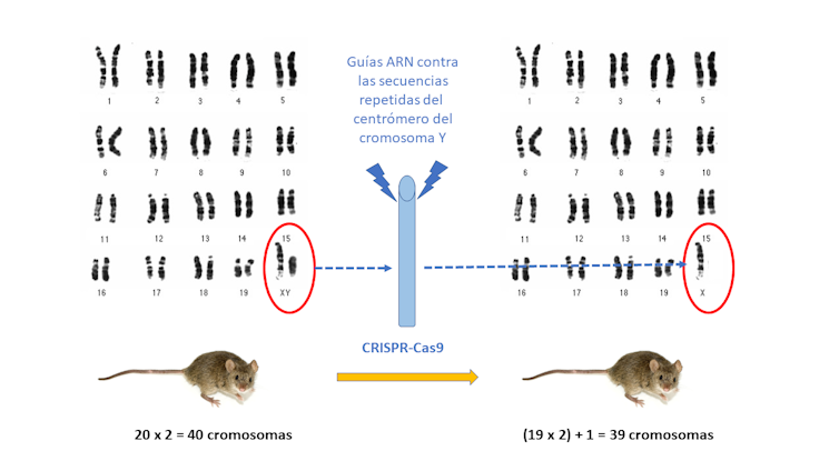 El experimento se explica fácilmente en dos pasos. Emplearon una estrategia CRISPR-Cas9 en ratones usando guías ARN complementarias a las secuencias repetidas que hay alrededor del centrómero del cromosoma Y. Así favorecieron la pérdida del cromosoma Y en ciertas células de la sangre, aprovechando las células madre hematopoyéticas de un ratón que expresaba constantemente la nucleasa Cas9.