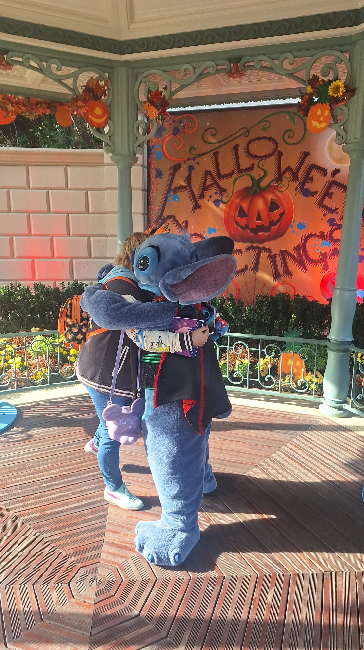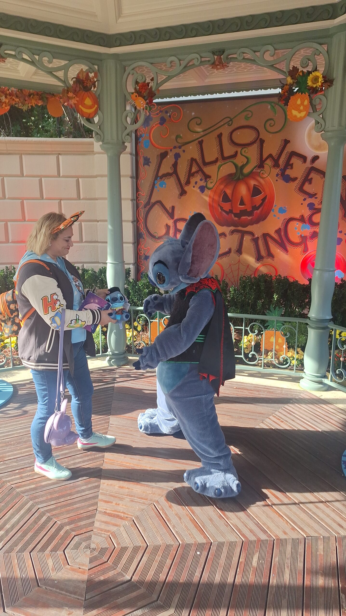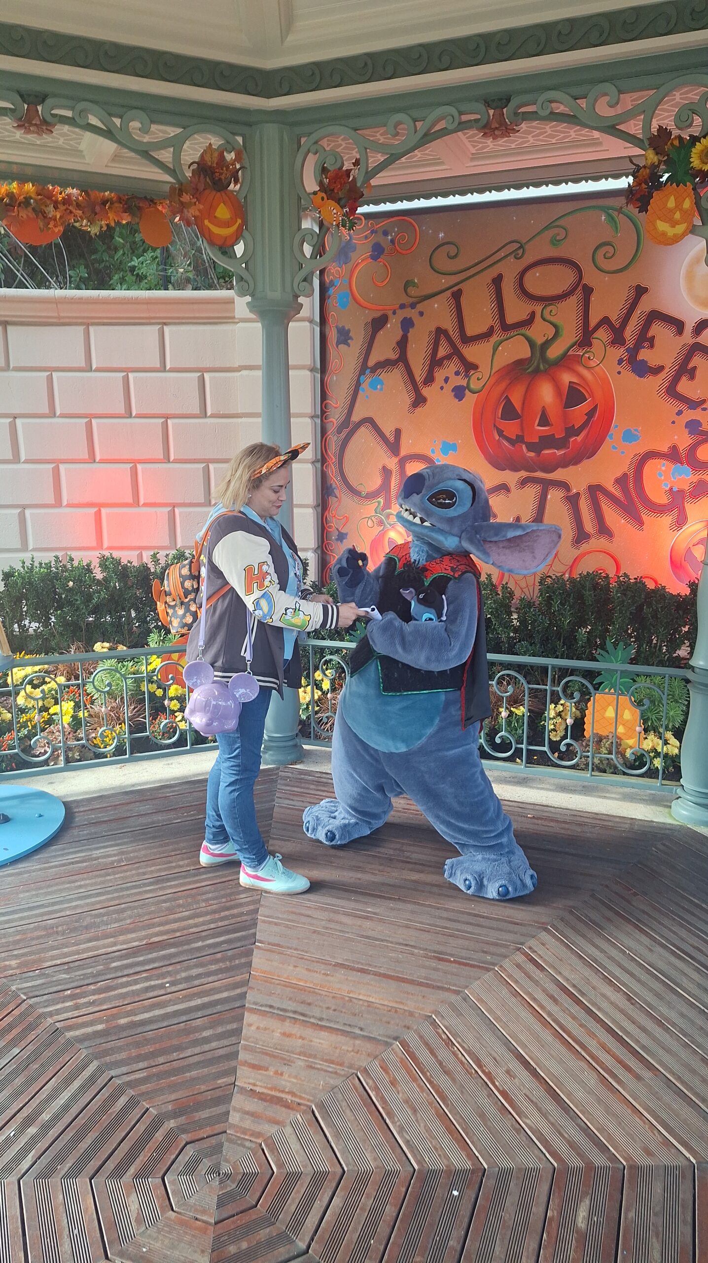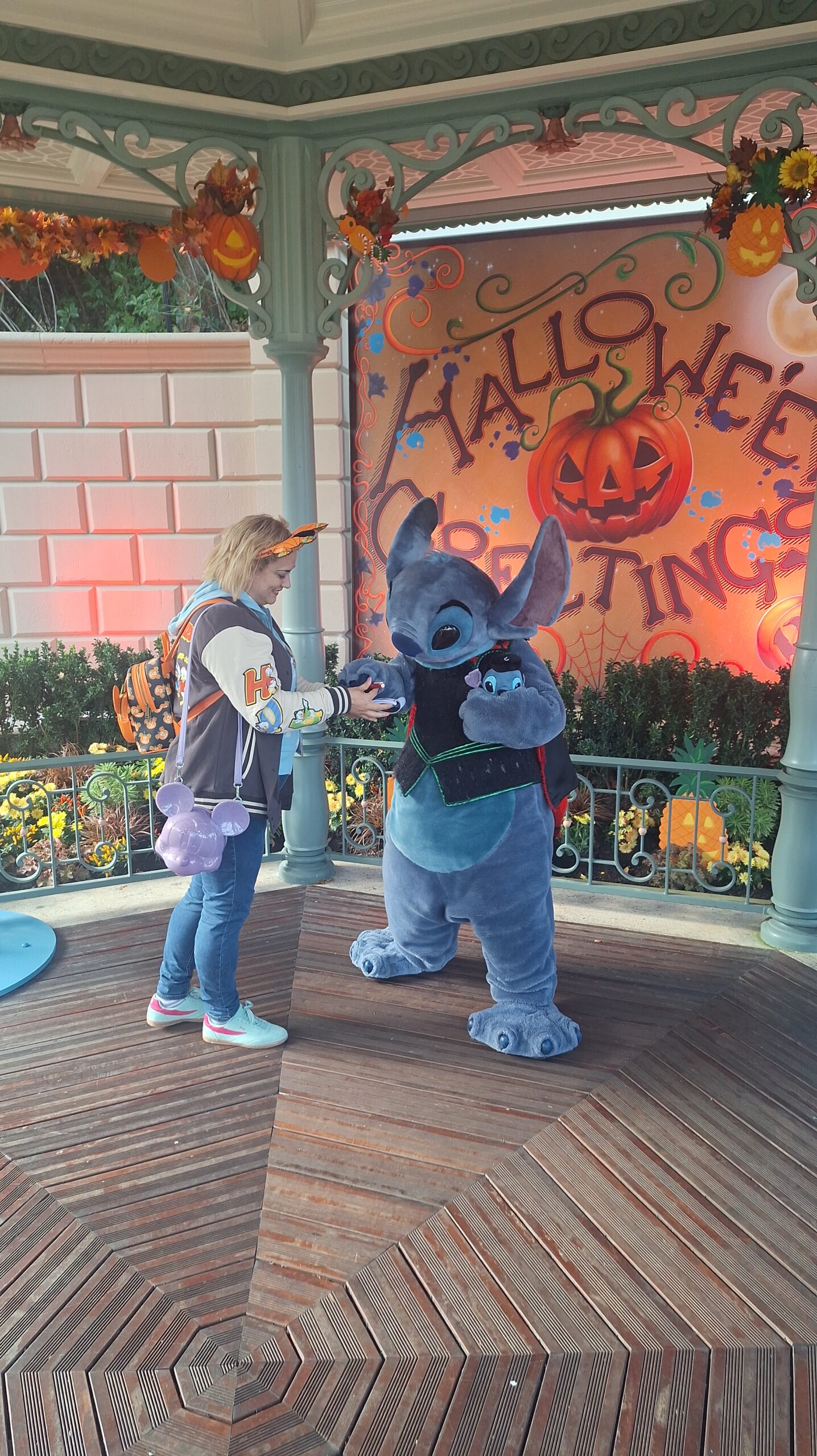 A Stitch le encantó mi mochila de calabaza de Halloween me dijo que: mi mochila y mis orejitas eran como su jardín (el de la zona donde el estaba) que iva muy guapa y que yo era su mejor ayudante y su mejor fan y yo le dije que el era mi personaje favorito y que estaba deseando estar con él y se alegro mucho, asi que este ha sido sin duda mi mejor encuentro❤️.