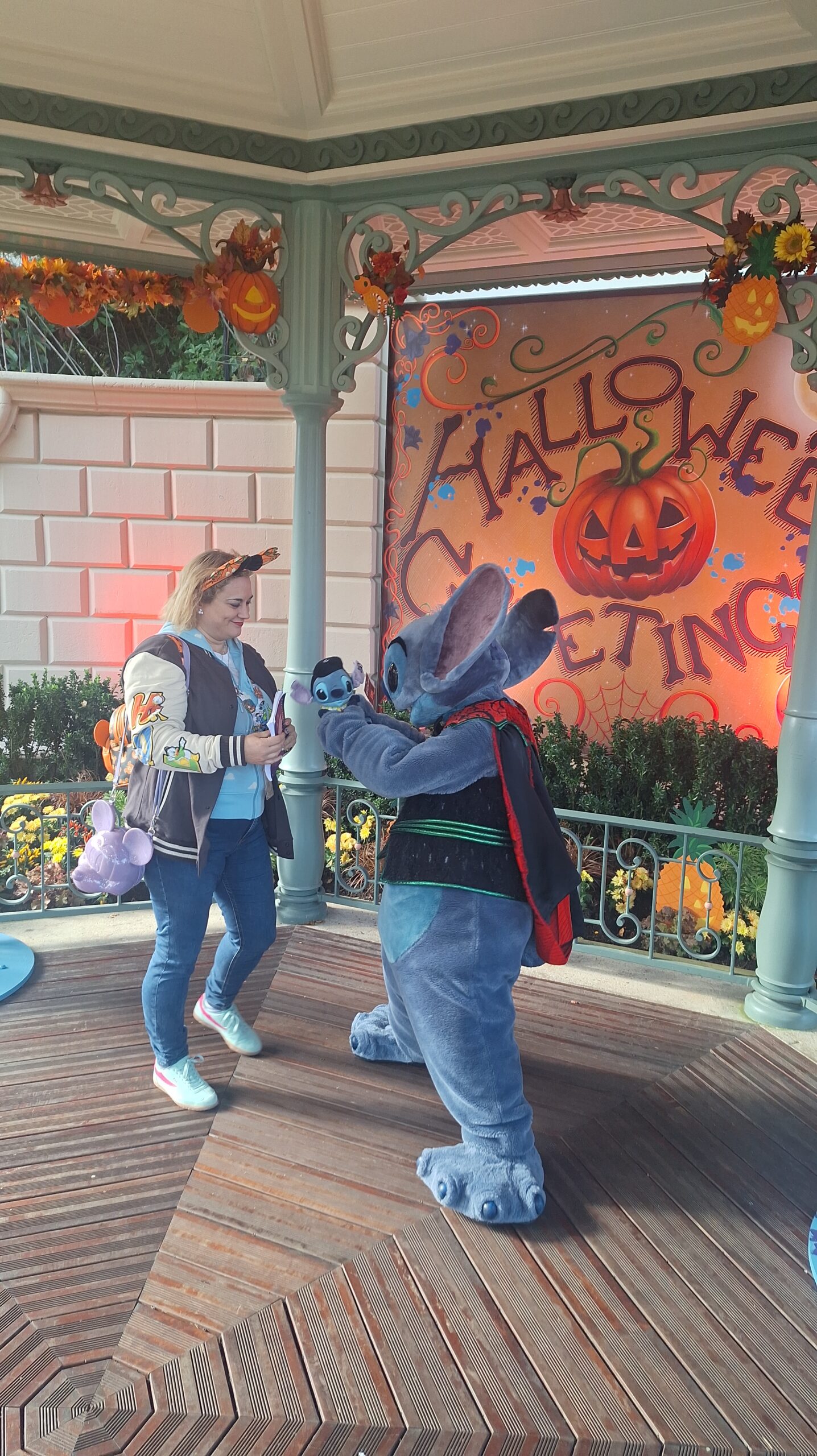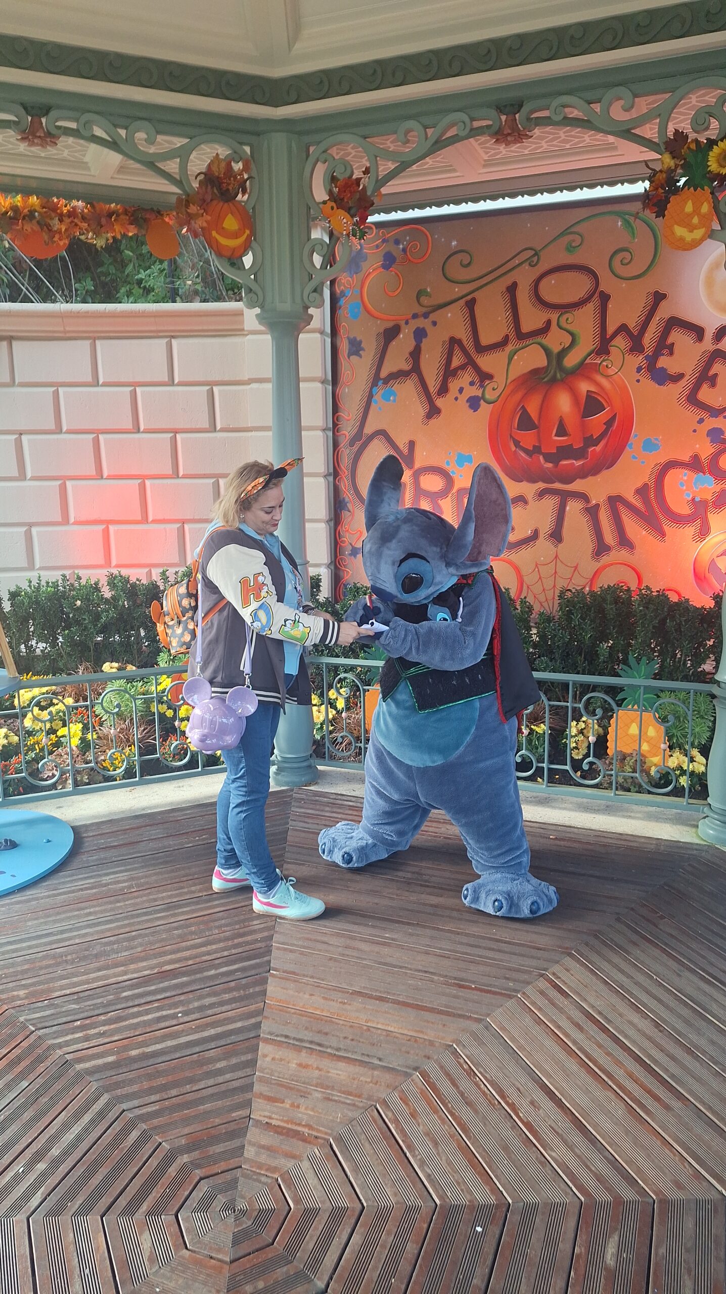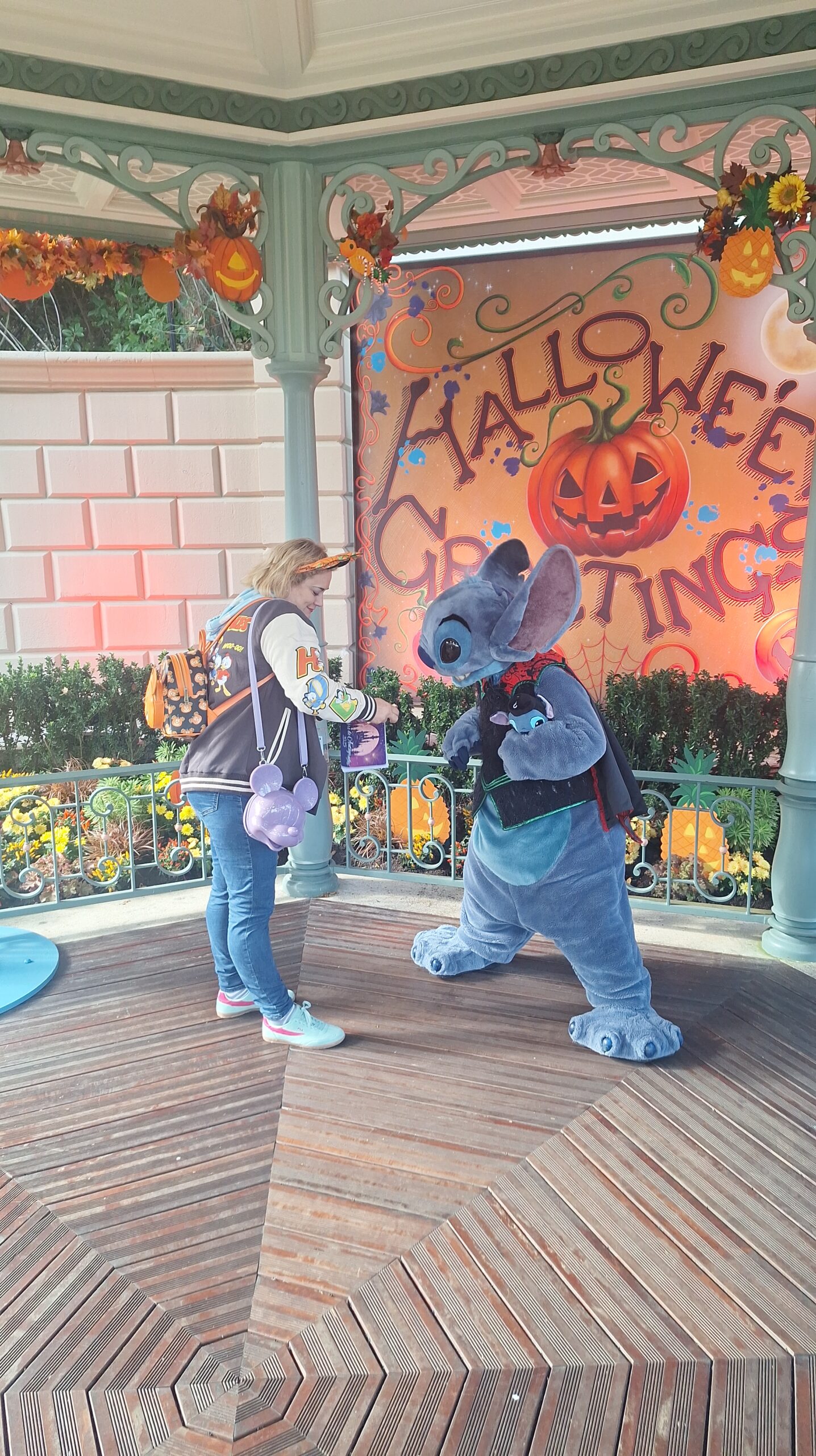 A Stitch le encantó mi mochila de calabaza de Halloween me dijo que: mi mochila y mis orejitas eran como su jardín (el de la zona donde el estaba) que iva muy guapa y que yo era su mejor ayudante y su mejor fan y yo le dije que el era mi personaje favorito y que estaba deseando estar con él y se alegro mucho, asi que este ha sido sin duda mi mejor encuentro❤️.